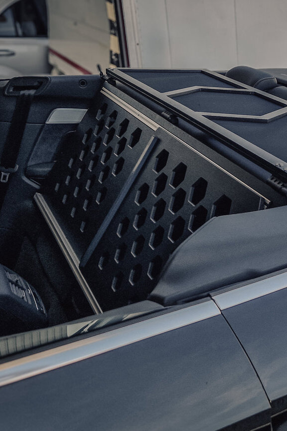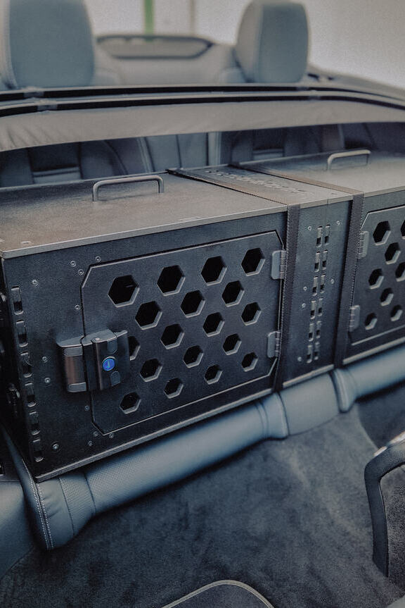 Die Cabriobox ist die Königsdisziplin im Hundebox-Bau. Wenig Platz, schmale Öffnungen und kaum gerade Flächen – und dennoch soll Ihr Hund komfortabel und sicher mitfahren können. Mit Swiss Blackhound ist das möglich.
